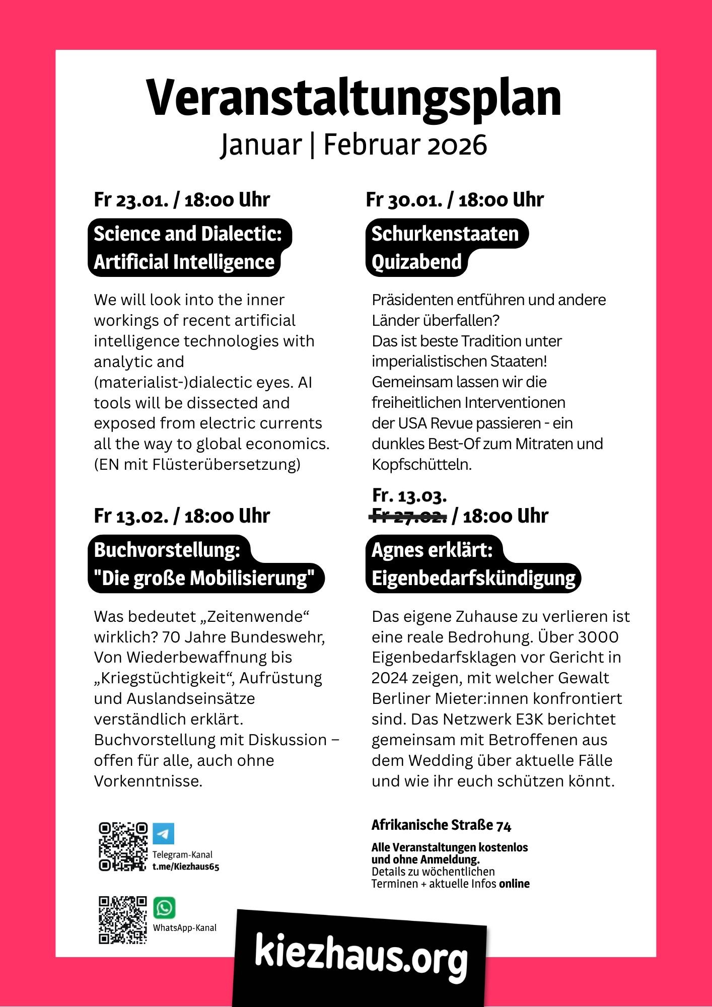 Alle Veranstaltungen werden auch nochmal separat angekündigt. Folgt dazu unserem Telegram oder WhatsApp-Kanal. Außerdem gibt es einen monatlichen Newsletter den ihr mit einer Mail an members@kiezhaus.org abonnieren könnt