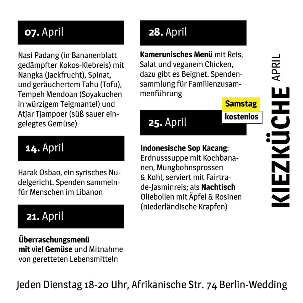 Wir laden ein zum gemeinschaftlichen Abendessen mit Nachbar:innen! Jeden Dienstag ab 18 Uhr im Kiezhaus. Alle Gerichte sind vegan falls nicht vorher anders gekennzeichnet. Warmes Essen gegen eine kleine Spende.